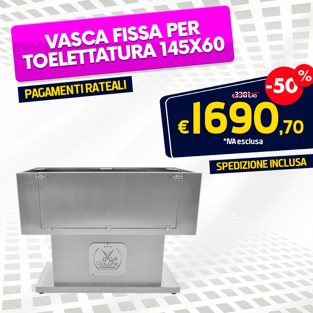 Vasca Fissa per Toelettatura cani e gatti in acciaio inox aisi 304 con portellone apribile e con cerniere in acciaio nautico. Filtro per raccogliere i peli in acciaio forato.